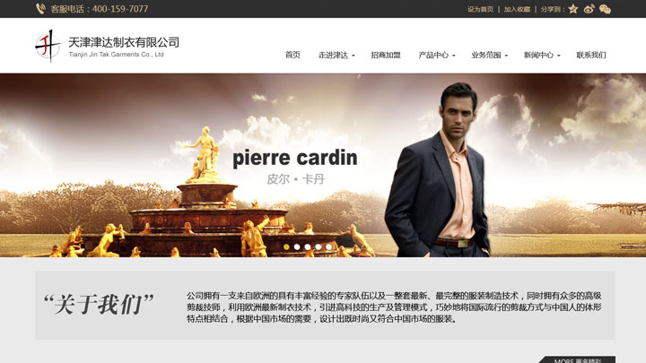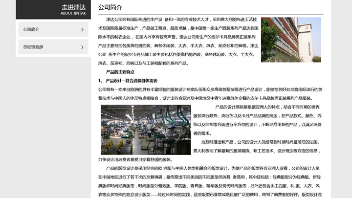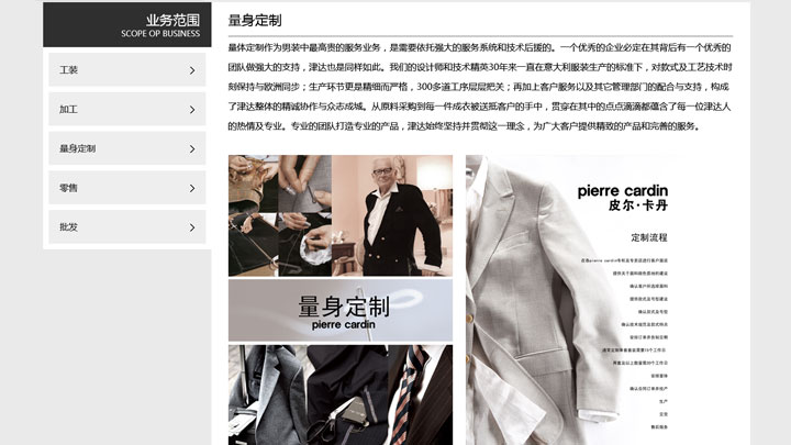津达公司拥有国际先进的生产设 备和一流的专业技术人才,采用意大利的先进工艺技术及国际质量标准生产,产品做工精良、品质卓越,是中国第一家生产西装系列产品达到国际水平的制衣企业, 在国内外享有较高声誉。津达公司所生产的皮尔卡丹品牌男正装系列产品主要包括各类高档男西装、商务休闲装、大衣、半大衣、风衣、茄克衫和西裤等。津达公司 所生产的皮尔卡丹品牌工装主要包括各类高档男西装、商务休闲装、大衣、半大衣、风衣、茄克衫、西裤以及与工装相配套的系列产品。